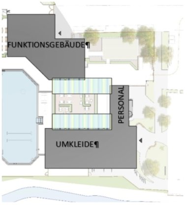 Besucher werden künftig durch eine neu gestaltete Grünanlage und einen modernen Haupteingang mit einem einladenden Dach begrüßt. Die Gebäude des Freibads sind klar in drei Bereiche gegliedert: