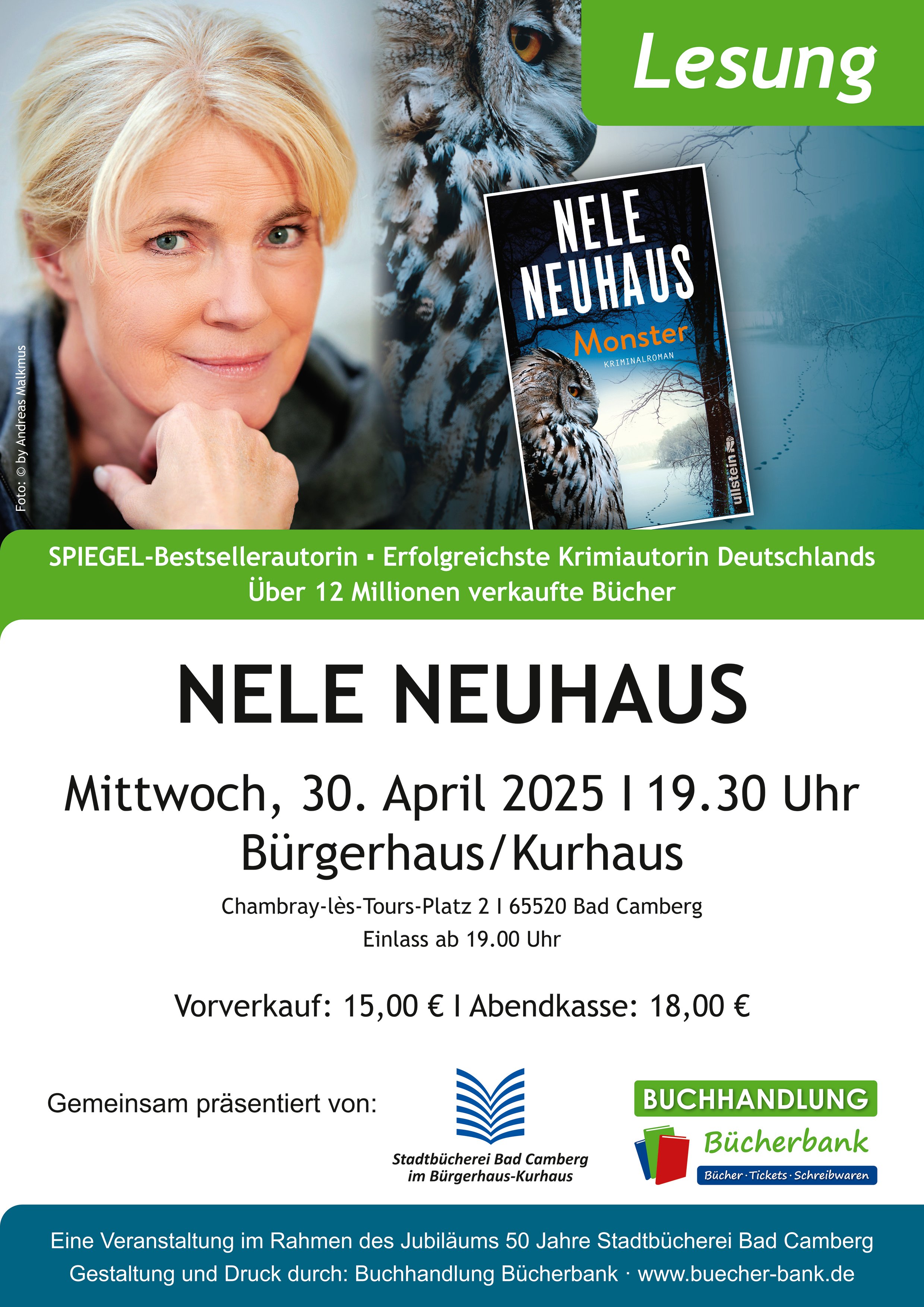 In Kooperation mit der Buchhandlung Bücherbank findet anlässlich des 50-jährigen Jubiläums der Camberger Stadtbücherei eine ganz besondere Lesung statt. Die Spiegel-Bestsellerautorin Nele Neuhaus liest am 30. April aus ihrem Buch "Monster". In der Geschichte kommt es auch zu Erwähnungen von Bad Camberg. Wir freuen uns, Nele Neuhaus als Gast in Bad Camberg begrüßen zu dürfen.