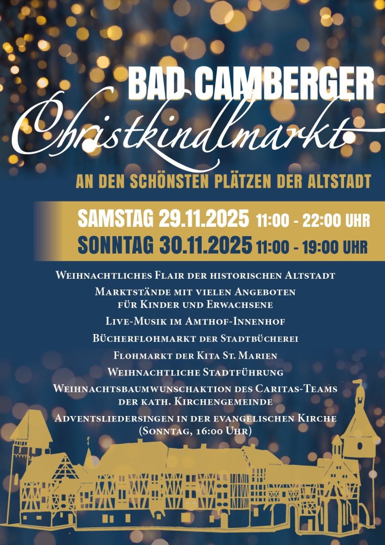 Eröffnet wird der Christkindlmarkt am Samstag um 11 Uhr auf dem Marktplatz durch Bürgermeister Daniel Rühl und Wolfgang Erk als Vorsitzendem des Vereins „Wir für Bad Camberg“ sowie den beiden Bad Camberger Pfarrern Bastian Michailoff und Joachim Wichmann. Musikalisch werden sie dabei unterstützt von einem Chor mit Kindern aus der Kindertagesstätte Rappelkiste.