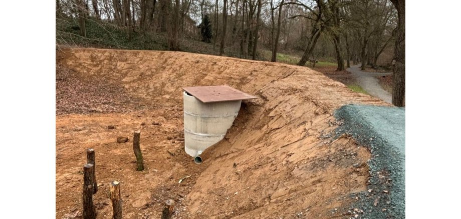 Zusätzlich wurden vor die Verrohrung, die das ablaufende Wasser in den weiterführenden Graben entlang der sogenannten Kastanienallee leitet, Betonringe mit zwei Kernbohrungen gesetzt. Dadurch wird der Ablauf aus dem Becken auf einen Durchmesser von 20 Zentimeter reduziert und führt zu einer regulierten Wasserabführung in den Graben auch bei starken Regenereignissen.