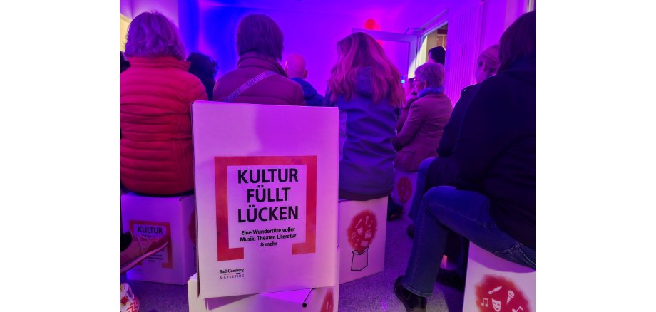 Die Veranstaltung wird einfach und unkonventionell durchgeführt. Sitzgelegenheiten für die Gäste, Licht und ein wenig Dekoration bilden den Rahmen. Nach dem Motto „Kultur füllt Lücken“ dürfen sich die Besucher auf ein abwechslungsreiches und unterhaltsames Überraschungsprogramm freuen, das aus vier kurzen 15-minütigen Programmpunkten besteht, die von einer kurzweiligen Moderation begleitet werden. Was passiert, bleibt geheim: Musik, Theater, Literatur, Kunst oder Comedy – alles ist möglich! Die Gäste sollen sich auf einen schönen Abend freuen und sich überraschen lassen.