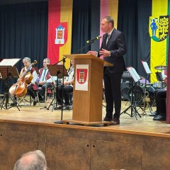 „Dieser Feiertag wäre bereits Grund genug für eine besondere Veranstaltung. Aber es gibt noch einen weiteren Grund, denn wir feiern den Tag der Deutschen Einheit passend gemeinsam mit Gästen aus der Partnerstadt Bad Sulza“, so Bürgermeister Daniel Rühl, der zahlreiche politische Mandatsträger der Stadt Bad Camberg, den heimischen Landtagsabgeordneten Andreas Hofmeister und Ehrenbürger Heinz Schaus unter den Gästen willkommen hieß, in seiner Begrüßungsrede. Daniel Rühl betonte den Stellenwert des „Tags der Deutschen Einheit“, zu dem der 3. Oktober im Einigungsvertrag 1990 deklariert wurde: „Trotz aller Schwierigkeiten des Einigungsprozesseses beider deutscher Staaten, trotz der Enttäuschungen insbesondere in den neuen Bundesländern und trotz allem, was sich in vier Jahrzehnten Teilung unterschiedlich entwickeln musste und mitunter bis heute unterschiedlich ist, bleibe ich dabei, dass die Wiedervereinigung die schönste Stunde der deutschen Geschichte ist!“