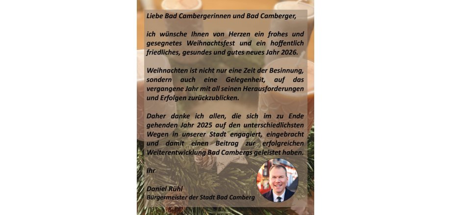 Daher danke ich allen, die sich im zu Ende gehenden Jahr 2025 auf den unterschiedlichsten Wegen in unserer Stadt engagiert, eingebracht und damit einen Beitrag zur erfolgreichen Weiterentwicklung Bad Cambergs geleistet haben.