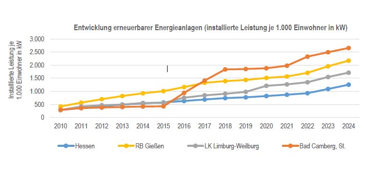 Die Auswertung der installierten Leistung und Stromerzeugung bezogen auf die Einwohnerzahl zeigt, dass die Stadt Bad Camberg mit 2.657 kW/1.000 EW (Einwohner) über dem hessischen Durchschnitt von 1.230 kW/1.000 EW liegt. Auch im kreisweiten Vergleich und innerhalb des Regierungsbezirks steht Bad Camberg mit der installierten Leistung pro Kopf über dem Durchschnitt.