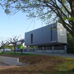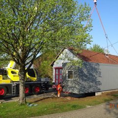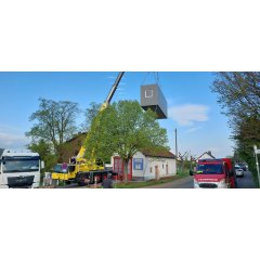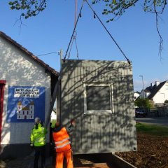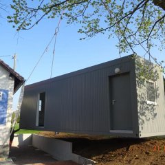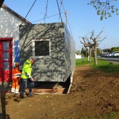 Dieses Modul wird mit dem Gerätehaus verbunden und dient als Umkleideraum für die Einsatzkräfte, da der bisherige Umkleidebereich den heutigen Anforderungen nicht mehr gerecht wird. Im Vorfeld wurden die Fundamente hergestellt und die Böschung abgestützt.