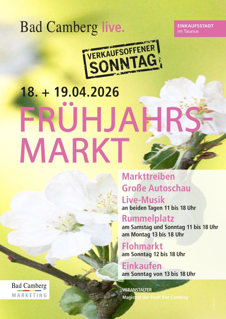 Neu sind in diesem Jahr sogenannte „Kulturspots“ und „KunstOasen“, die an mehreren Orten in der Innenstadt errichtet werden. In den „KunstOasen“ wird an beiden Tagen inspirierende Kunst in leerstehenden Ladenlokalen geboten. Ausgestellt werden Werke der Künstler der Amthof-Galerie sowie historische Filmplakate. Dazu gibt es Lesungen des Autorentreffs Bad Camberg. An den „KulturSpots“ sorgt an beiden Tagen Musik für gute Stimmung, Spaß und Unterhaltung mitten in der Stadt. Es treten auf: die Sopranistin Hanna Czarnetzka, Adrian Gabriel mit seinem Klavierwagen, der Saxophonist Andreas Nilges, das Improtheater SUBITO!, Punkt 8, der Jazz-Chor des Jazz-Clubs Goldener Grund, Thomas Knorr als mittelalterlicher Barde und das Akkordeon Orchester der Musikschule Idstein. Kunst und Kultur in leerstehenden Ladenlokalen sorgen so für Abwechslung und Kurzweil und bringen eine ganz neue Facette in den Frühjahrsmarkt ein.
