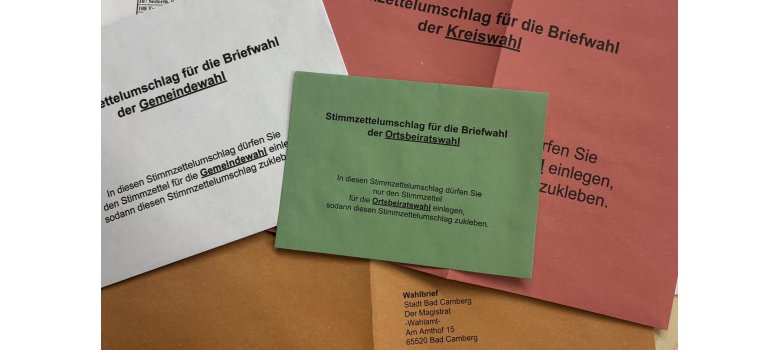Nach der Beantragung im Internet oder per Mail werden Ihnen die notwendigen Unterlagen zugesandt. Die ausgefüllten Briefwahlunterlagen müssen spätestens bis zum Wahltag, 15. März 2026, 18 Uhr im Briefkasten des Rathauses, Verwaltungsgebäude II, Am Amthof 15, 65520 Bad Camberg eingeworfen sein.